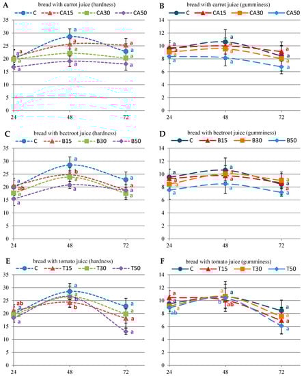 Crumb hardness [N] and gumminess during three days of storage for the experimental bread made with the formulation without (C) or with carrot (CA) juice ((A) hardness; (B) gumminess); beetroot (B) juice ((C) hardness; (D) gumminess); tomato (T) juice ((E) hardness; (F) gumminess). Points represent means ± standard deviation, (n = 6, for each bread type). The values within each type of bread marked with different letters are significantly different (p < 0.05).