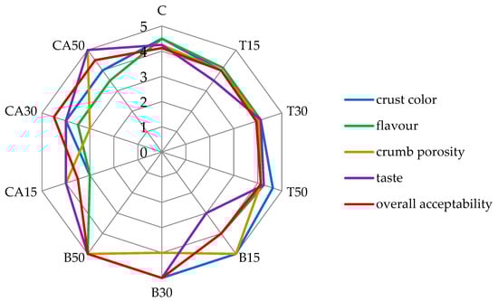 The addition of tomato juice did not significantly change the sensory characteristics of the bread according to the evaluation panel (Figure 3). However, carrot and beetroot juices had a significant impact on the sensory features. The most preferred and highest rated was the bread variant with 50% of beetroot juice. The 15% of carrot juice had a negative effect on the bread flavor, porosity and color, but its higher addition (50% replacement of water) had a positive effect on the taste and porosity of the crumb, but its flavor and crust color was rated lower than a control sample. Taking into account the overall acceptability of the bread with the addition of vegetable juices, the samples with 30% and 50% of beetroot and carrot juices obtained higher scores in the sensory evaluation compared to the control sample (Figure 3). A big influence on overall acceptability was the taste of the bread, shaped by acidity, flavor substances and aroma compounds contributed by the juices. Even though darker colors are undesirable in numerous foods, consumers believe that darker bread is healthier than lighter [], so the addition of beetroot juice could positively influence this perception. Other research proved that the additives of vegetable purees contributed to the production of bakery products with high organoleptic characteristics and nutritional value [].