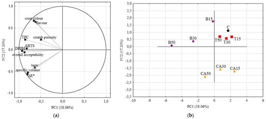 A PCA chemometric analysis was conducted to evaluate and demonstrate changes in wheat breads, as influenced by the type and level of vegetable juice addition. The first two principal components explained 75.32% of the total variability. Figure 4a shows the distribution of samples in two-dimensional space relative to the first and second principal components.