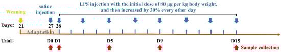 Fifty healthy Duroc × Landrace × Yorkshire piglets (6.98 ± 0.14 kg, and barrow) were selected and weaned at 21 d of age. After a 7 d adaptation, they were randomly allotted to 5 groups with 10 replicate per treatment. In a temperature-controlled nursery barn (25 to 27 °C), the piglets were kept separately in 1.80 × 1.10 m cages with unrestricted access to clean water and food. The piglets in the control group (group 0 d) were injected with 0.90% sterile saline and slaughtered using electrical stunning at 1 d before the trial. From day 1 of the trial, the piglets in the other four groups were challenged with LPS (E. coli serotype 055: B5; Sigma Chemical, St Louis, MO, USA), which was dissolved in sterile saline with the initial dose of 80 μg per kg body weight, and then increased by 30% every other day [25], and slaughtered at 1, 5, 9, and 15 d of the trial (groups 1 d, 5 d, 9 d, and 15 d). Piglets were weighed individually at the start and final day and feed consumption was recorded. The scheme of the experimental design was shown in Figure 1. All piglets were provided the same diets during the feeding experiment and the ingredients and nutritional values are shown in Table 1, which met the National Research Council (2012) nutrient requirement [27]. The experimental period lasted for 15 days.