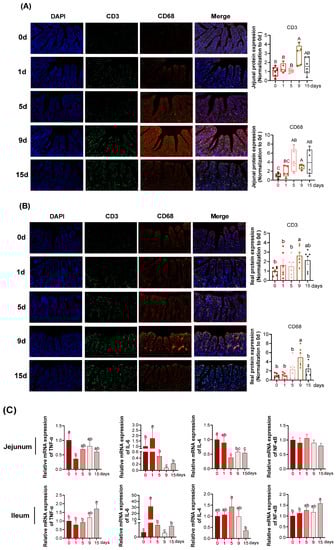 In jejunum (Figure 3A), the quantification of CD3+-positive cells reached the highest at 9 d (p < 0.05), whereas no differences were obtained among the rest of four groups (p > 0.05). Compared with the 0 d, the quantification of CD68+-positive cells significantly increased at 5, 9 and 15 d and showed an increased trend at 1 d (p > 0.05). In ileum (Figure 3B), the quantification of CD3+ and CD68+-positive cells both achieved the highest at 9 d (p < 0.05).