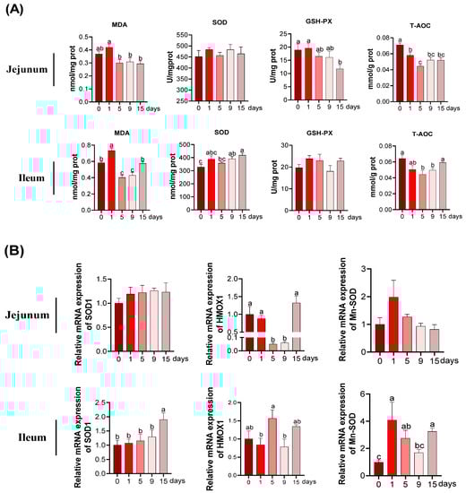 Real time-qPCR was performed to determine the mRNA expression of anti-oxidative related genes. In jejunum (Figure 4B), the decrease in the HMOX1 mRNA expression was observed at 5 d and 9 d in comparison to of 0 d (p < 0.05). No difference was observed in relative mRNA expression of SOD1 and Mn-SOD among the groups (p > 0.05). In ileum (Figure 4B), the relative mRNA expression of SOD1 was remarkably elevated at 15 d compared to that in the other groups (p < 0.05). The relative mRNA expression of HMOX1 achieved its highest mark at 5 d and then reverted to a similar value at 15 d as that at 0 d (p < 0.05). In comparation with 0 d, the relative mRNA expression of Mn-SOD significantly increased at 1 d, 5 d, and 15 d (p < 0.05).