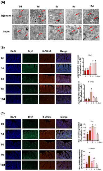 In jejunum, as shown in Figure 5B, the expression of dynamin-related protein 1 (Drp1) significantly increased at 9 and 15 d and 8-hydroxy-2′-deoxyguanosine (8-OHdG) reached the highest mark from 5 d to 9 d (p < 0.05). In ileum (Figure 5C), the protein expression of Drp1 was significantly increased at 5 and 9 d compared to those at 0 d, and reverted to a value similar to 0 d at 15 d (p < 0.05). Additionally, an increase in protein expression of 8-OHdG was observed with a maximum level at 1 d (p < 0.05).