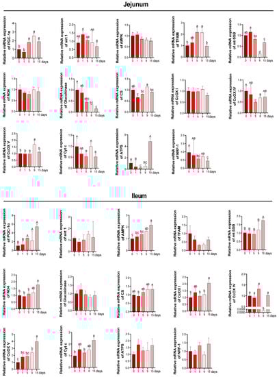As revealed in Figure 5A, a complete inner membrane and wider cristae in ileal mitochondria structure were observed at 0 d and 15 d, and the mitochondrial structural alteration including mitochondria swelling, scanty cristae, and vacuolization were observed on other days. However, structural alteration to jejunal mitochondria persisted until 15 d.