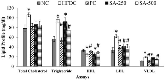 All the treatment groups significantly (p ≤ 0.05) reduced the elevated levels of serum TC. Treatment group PC and SA-500 showed significant (p ≤ 0.05) reduction in the TG, LDL and VLDL levels and recovered HDL level when compared to the HFDC group (Figure 2). A protective effect was shown by SAT (500 mg/kg BW) vs. PC groups in the plasma where TC, TG, HDL, LDL and VLDL levels were 85.1 vs. 82, 73.4 vs.53, 28.5 vs. 31, 41.9 vs. 40 and 14.6 vs. 11 mg/dl respectively as shown (Figure 2). Furthermore, the serum total cholesterol concentrations in all treated groups were not significantly different from the normal control group at the end of the treatment.