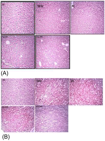 Histopathological images of (A) liver and (B) kidney of different rat groups showing the morphological changes. NC, normal control; HFDC, high fat diet control; PC, positive control; SA-250 and SA-500, Star anise 250 and 500 mg/kg BW.