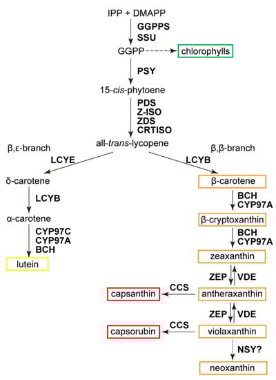 In addition to tomato fruit [13], chili pepper (Capsicum annuum) is also one of the major carotenoid-accumulating crops in the Solanaceae family, of which capsanthin (and capsorubin, in some varieties) is the predominant carotenoid species in ripened fruits [7]. Metabolically, carotenoid biosynthesis starts from geranylgeranyl diphosphate (GGPP), a C20 linear terpenoid intermediate that is also used for synthesizing the phytol side-chain of chlorophylls and tocopherols [5,14,15]. Two molecules of GGPP are condensed by phytoene synthase (PSY), which specifically directs the metabolic flux toward carotenoid biosynthesis [14]. After two steps of desaturation by phytoene desaturase (PDS) and ζ-carotene desaturase (ZDS), and two steps of isomerization catalyzed by ζ-carotene isomerase (Z-ISO) and carotene isomerase (CRTISO), phytoene is converted into lycopene, the first branching point in the carotenoid metabolic pathway (Figure 1). Two types of cyclase, lycopene β- and ε-cyclases (LCYB and LCYE, respectively), catalyze the production of β-carotene (β,β-carotene) and α-carotene (β,ε-carotene), thus forming the β,β- and β,ε-branches beyond lycopene (Figure 1). Hydrocarbon β- and α-carotenes are further hydroxylated into zeaxanthin and lutein, respectively. Zeaxanthin epoxidase (ZEP) and violaxanthin de-epoxidase (VDE) catalyze together a reversible reaction among zeaxanthin, antheraxanthin, and violaxanthin (Figure 1) [6,14]. These three oxygenated β,β-branch carotenoids form the xanthophyll cycle in leaves as an essential photoprotective mechanism, and antheraxanthin and violaxanthin are also precursors for the biosynthesis of capsanthin and capsorubin, respectively, in chili pepper fruits (Figure 1) [16,17,18,19].