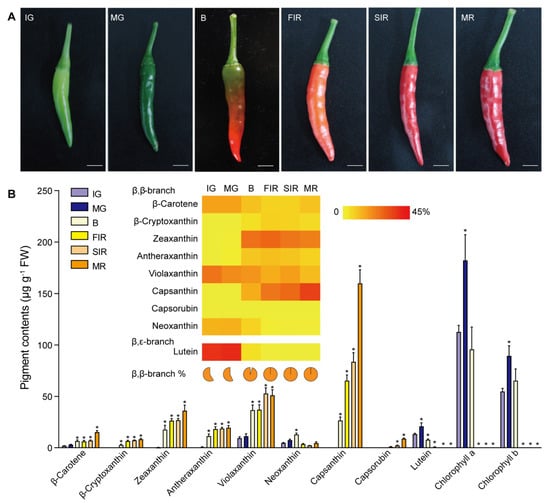 Variations of pigment contents in ripening chili pepper fruits. (A) Six stages of ripening chili pepper fruits. Abbreviations for each stage of samples: IG, immature green (ca. 15 days post anthesis [DPA]); MG, mature green (ca. 30 DPA); B, breaking (ca. 35 DPA); FIR, first immature red (ca. 38 DPA); SIR, second immature red (ca. 43 DPA); and MR, mature red (ca. 50 DPA). Scale bars = 1 cm. (B) Analyses of pigment contents in ripening chili pepper fruits. Carotenoids and chlorophylls were extracted from fruits at different ripening stages, separated by HPLC and then quantified. FW, fresh weight. Data are means ± SEM (n = 3). * Significantly different from the pigment content in IG stage (p < 0.05; one-way ANOVA and Tukey’s multiple comparisons test); the detailed statistics are provided in Table S2. Inset shows the percentages of separate carotenoid species in the total carotenoid pool. The percentage of all carotenoids of the β,β-branch in the pool is also calculated.
