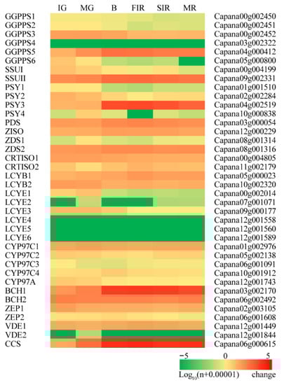 Capsanthin/capsorubin synthase (CCS) is the enzyme that catalyzes the biosynthesis of capsanthin and capsorubin from zeaxanthin and violaxanthin, respectively [17,19]. Our quantification demonstrated that the transcripts of CaCCS started to accumulate from the IG stage, peaked at the FIR stage, and maintained a relatively high level at the final MR stage (Figure 4).