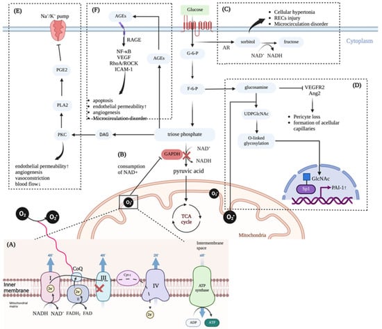 (A) Under the condition of high glucose, the overload of NADH and FADH2 produced by the TCA cycle in retinal cells can induce high mitochondrial membrane potential, which makes the ETC stagnate in complex III, and the electrons and protons accepted by CoQ are difficult to transfer to the downstream. At this time, O2 can be used as electron acceptors to generate superoxide. (B) The accumulation of intracellular superoxide can consume NAD+, thus inhibiting the activity of GAPDH and blocking the glycolytic pathway. (C) The polyol pathway of glycolysis is activated, that is, glucose is converted into sorbitol under the action of aldose reductase, and sorbitol can be catalyzed by NAD+ into fructose. Due to the consumption of NAD+, sorbitol accumulates, leading to cell hypertonicity, damaging retinal capillary endothelial cells, and causing microcirculation disorders. (D) The metabolic pathway of hexosamine is activated. The produced glucosamine can lead to the loss of retinal pericytes and the formation of acellular capillaries by inhibiting VEGFR2 and Ang2 in the normal retina. At the same time, the production of UDPGlcNAc increases, promoting the synthesis of O-linked glycoprotein. The latter covalently modifies transcription factor Sp1, activating the expression of glucose-responsive gene Pal-1 in vascular smooth muscle cells, thus promoting the occurrence of DR. (E) The decrease of GAPDH activity leads to the increase of triose phosphate, which can produce DAG and also participate in the formation of various AGEs. DAG can directly activate PKC, increasing the activity of PLA2 and promoting the production of PGE2, thereby inhibiting the activity of Na+/K+ ATPase. PKC itself is associated with increased permeability of retinal vascular endothelial cells, angiogenesis, vasoconstriction, and decreased blood flow. (F) AGEs can interact with RAGE to promote the activation of NF-κB, upregulate the expression of VEGF and ICAM-1, and activate the RhoA/ROCK signaling pathway, thus promoting apoptosis, increasing vascular permeability, causing microcirculation disorders, and inducing angiogenesis in the retina. Abbreviations: NADH, nicotinamide adenine dinucleotide; FADH2, flavine adenine dinucleotide, reduced; TCA cycle, tricarboxylic acid cycle; ETC, electron transfer chain; CoQ, coenzyme Q; NAD+, nicotinamide adenine dinucleotide; VEGFR2, vascular endothelial growth factor receptor 2; Ang2, angiopoietin-2; UDPGlcNAc, uridine diphosphate-N-acetylhexosamine; Pal-1, plasminogen activator inhibitor-1; GAPDH, glyceraldehyde-3-phosphate dehydrogenase; DAG, diacylglycerol; PKC, protein kinase C; PLA2, phospholipase A2; PGE2, prostaglandin E2; AGE, advanced glycation end products; RAGE, receptor for advanced glycation end products; NF-κB, nuclear factor kappa-B; VEGF, vascular endothelial growth factor; ICAM-1, intercellular cell adhesion molecule-1; Cyt c, cytochrome c; G-6-P, glucose-6-phosphate; F-6-P, fructose-6-phosphate. The figure is created with biorender.com (https://biorender.com/, accessed on 2 October 2022).
