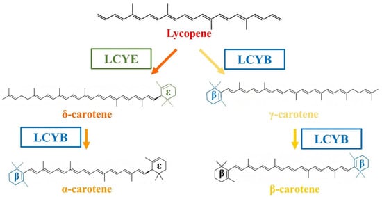 Biosynthesis pathway for α-carotene and β-carotene. Red arrows represent the α-carotene-forming branch, while black arrows represent competing branch leading to β-carotene. Enzymatic conversions were shown by arrows with related enzymes involved in each reaction. The conversion of lycopene to β-carotene requires only lycopene β cyclase. The conversion of lycopene to α-carotene requires both lycopene β and ε cyclases.