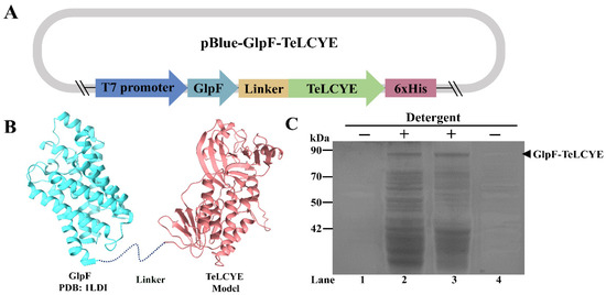 Construction and expression profiles of TeLCYE targeted to E. coli membrane. (A) The fusion structure of pBlue-GlpF-TeLCYE expression vector. GGGSGGGS was added as the linker. (B) The schematic model of fusion GlpF-TeLCYE. The structural model of TeLCYE was predicted by SWISS-MODEL. (C) SDS-PAGE validation for GlpF-TeLCYE expressed in BL21 (DE3). Lane 1, supernatant after cell lysis. Lane 2, detergent solubilized membrane supernatant after ultracentrifugation. Lane 3, detergent solubilized membrane precipitation after ultracentrifugation. Lane 4, membrane collection supernatant after ultracentrifugation.