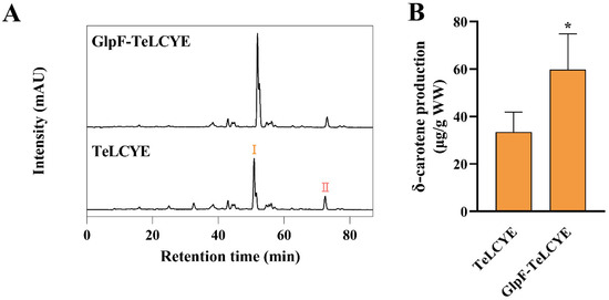 We next attempted to consolidate the functional relevance of the membrane localization of TeLCYE in the E. coli host. The functional analysis of TeLCYE was investigated by transforming TeLCYE and GlpF-TeLCYE constructs into lycopene-accumulating E. coli, respectively. As shown in Figure 3A,B, δ-carotene as the directly cyclized metabolite was detected in both strains containing TeLCYE and GlpF-TeLCYE. It is to be noted that 1.8-fold higher δ-carotene production was obtained by membrane-targeted TeLCYE than that by free TeLCYE, indicating a strikingly improved catalytic efficiency of TeLCYE in membrane localization. In a previous study, GlpF was used as the membrane-localized tag for the expression of carotenoid cleavage dioxygenase from Petunia hybrida in E. coli without changing its function [27]. Likewise, the function of TeLCYE in our study was confirmed imperiously by GlpF in E. coli. In the meantime, membrane-targeted TeLCYE expressed in E. coli achieved the similar enhanced catalytic functionality as membrane-targeted mLCYE from Tagetes erecta expressed in yeast, indicating the necessity of membrane-compartment optimization for plant LCYEs expression in heterologous hosts. These results strongly confirmed that TeLCYE catalytic efficiency could be enhanced via spatially membrane-targeted regulation.