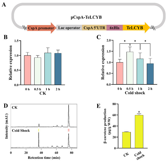 Activation of TeLCYB by CspA promoter under cold shock treatment in lycopene-accumulating E. coli. (A) The fusion structure of pCspA-TeLCYB expression vector with N-terminal CspA promoter, lac operator, CspA-5’UTR, and 6xHis tag. (B,C) The relative expression profiles of TeLCYB without (B) or with (C) cold shock treatment in two hours. (D) HPLC spectra of XL-1 Blue strains harboring pAC-LYC and pCspA-TeLCYB with or without cold shock treatment. Ⅰ, β-carotene; Ⅱ, lycopene. (E) β-Carotene-accumulation patterns in XL-1 Blue strains harboring pAC-LYC and pCspA-TeLCYB with or without cold shock treatment. (*) p < 0.05.