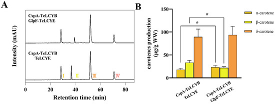 Initiation of membrane-targeted TeLCYE at the starting stage to mediate α-/β-carotene stoichiometry. (A) HPLC spectra of lycopene-accumulating strains harboring pBlue-TeLCYE or pBlue-GlpF-TeLCYE separately co-transformed with pCspA-TeLCYB cultured at 37 °C without cold shock. Ⅰ, α-carotene; Ⅱ, β-carotene; Ⅲ, δ-carotene; Ⅳ, lycopene. (B) Carotene-accumulation patterns in lycopene-accumulating strains harboring pBlue-TeLCYE or pBlue-GlpF-TeLCYE separately co-transformed with pCspA-TeLCYB cultured at 37 °C without cold shock. (*) p < 0.05.