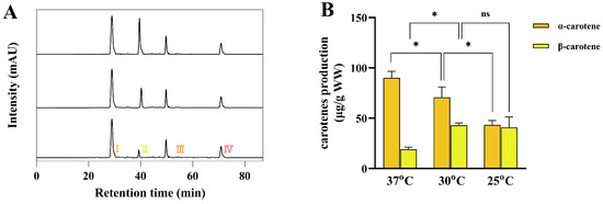So far, the low competitivity of TeLCYE against TeLCYB was exempted at the starting stage by the above approaches; we next turned our attention to the efficient accumulation of α-/β-carotenes. Based on the above results, TeLCYE with high activity at the initial starting stage contributed the redundant δ-carotene as the major product. Thus, the efficient conversion of δ-carotene into α-carotene at the end stage became the first issue needing to be reframed. Since we assumed that TeLCYB was expected to be efficiently boosted by the CspA system at the end stage, then the obtainable amounts of α-/β-carotenes would be achieved in a rational manner. Indeed, α-/β-carotenes with a sharply decreased peak of δ-carotene were achieved in a lycopene-accumulating strain containing GlpF-TeLCYE and CspA-TeLCYB by performing the starting stage of 37 °C for 24 h and the end stage of cold shock for 2 h (Figure 6A). However, the ultimate goal was to fulfill health requirements with α-/β-carotenes along with distinct high α-/β-carotene stoichiometries at the end stage. As we have noted that α-/β-carotene stoichiometries depended on the initial activities of TeLCYE at the starting stage, the dynamical regulation of TeLCYE activity was practically essential for distinct high α-/β-carotene stoichiometries. A previous study reported that LCYE activity is temperature-dependent in E. coli, and increased temperature elicits stronger activity of LCYE [43]. This result encouraged us to gain insight into the effect of various temperatures on the dynamical modulating of TeLCYE activities in our study; therefore, α-/β-carotene stoichiometries were conducted by cultivating the lycopene-accumulating strain harboring GlpF-TeLCYE and CspA-TeLCYB under different temperatures at the starting stage for 24 h, followed by the same end stage of cold shock for 2 h. As shown in Figure 6B, different α/β-carotene stoichiometries finally reached 4.71 at 37 °C, 1.65 at 30 °C, and 1.06 at 25 °C, respectively, indicating the alternatively accumulated high α/β-carotene stoichiometries by performing increased temperature variations at the starting stage. These results were consistent with the primary expectation, displaying that distinct high α/β-carotene stoichiometries were easily obtained by dynamically temperature-programmed regulation.