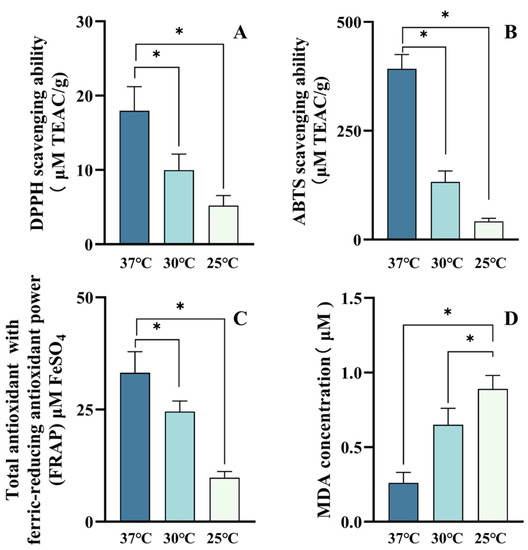 Antioxidant activities of α-/β-carotenes with different stoichiometries. DPPH scavenging ability (A), ABTS scavenging ability (B), total antioxidant with ferric-reducing antioxidant power (C), and MDA content (D) of α-/β-carotenes with different stoichiometries produced under different temperature cultivations at starting stage and cold shock treatment at end stage. (*) p < 0.05.