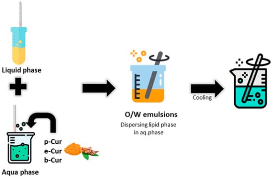 Experimental process for the preparation of p-Cur, e-Cur and b-Cur O/W emulsions.