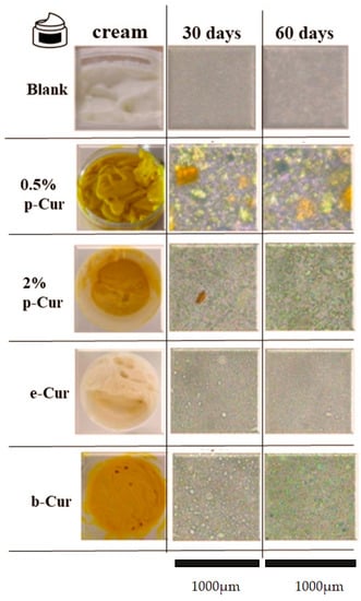 Once an emulsion has been prepared, it is vital to remain stable and retain its initial properties throughout its storage time. Emulsions may breakdown due to various destabilization mechanisms including creaming, flocculation and coalescence []. The international literature proposes a variety of methods for studying the stability of emulsions [,,,,]. Unfortunately, the instability affects their storage as they tend to separate and breakdown. In this context, macroscopic and microscopic tests to control the stability, viscosity and pH, as well as particle size distribution of the emulsions, are conducted. These include optical observation, pH and viscosity measurements, and estimation of the dispersed-phase droplet size density. In that sense, the particle size and the droplet stability of the prepared emulsions were investigated over a period of 60 days using an optical microscope. Table 2 presents the particle size and span for each emulsion, 30 and 60 days after preparation, respectively. Additionally, the images in Figure 2 demonstrate the optical analysis of each emulsion using a ×20 lens for the depiction of particle size of the internal phase. Specifically, blank emulsion presents a medium droplet size, stable until 60 days after fabrication, which was also confirmed by optical analysis. The obtained micrographs showed the formation of yellow solid agglomerates regarding the emulsions containing 0.5 and 2% p-Cur, with the ones at 0.5% emulsion being larger []. These results are attributed to the poor solubility and stability of p-Cur in aqueous media. However, the droplet size remains unaltered for up to 60 days after fabrication []. Results from microscope images of b-Cur emulsions exhibited smaller droplet size and high stability, since β-Cyclodextrin operates as a carrier of Cur, significantly enhancing its solubility and stability []. Moreover, the e-Cur emulsion contained droplets having smaller size but exhibiting higher stability than b-Cur emulsions, owing to the enhanced solubility of e-Cur []. Additionally, the span values of samples were calculated and studied considering that a monodisperse distribution has a span of 0 []. The results (Table 2) showed that the span of 0.5 % p-Cur emulsion was small (<2) during 30 and 60 days, presenting a narrow particle size distribution profile [,]. However, the addition of b-Cur, e-Cur and larger amount of p-Cur (2%) increased the span values, indicating a decrease in the homogeneity of emulsions.
