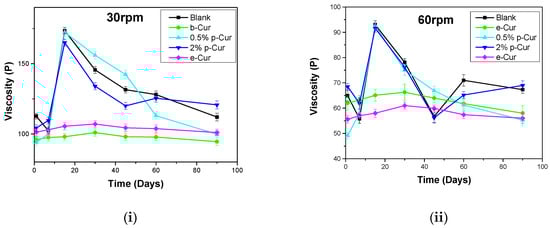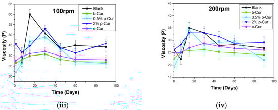 As RPM increases, droplet flocs or Cur agglomerates progressively deform and break down, thus decreasing flow resistance and viscosity. The produced emulsions exhibited different viscosity stability depending on Cur derivatives. In the case of p-Cur-based emulsions, the emulsions containing p-Cur either 0.5 or 2% wt showed the highest viscosity in 30, 60, 100 and 200 RPM. In particular, 0.5%and 2% p-Cur emulsions exhibited an increase higher than 10% in viscosity after 20 days and a decrease higher than 10% after 90 days of storage. This is a common behavior of emulsions containing agents in the form of powder, which leads in their flocculation. In the first stage, the agglomerates hinder the stirring, thus increasing the viscosity, while the following reduction in viscosity is attributed to the breakage of the agglomerates, producing more homogenous emulsions []. On the contrary, b-Cur and e-Cur emulsions showed an increase (less than 10%) in viscosity up to 30 days, and then a small decrease was observed up to 90 days (again less than 10% from the initial value), indicating that the prepared formulations show excellent performance in terms of stability. Similar results were observed in the case of 30, 60, 100 and 200 rpm []. In all these cases the particle size defines the viscosity stability of emulsions. The smaller the particle size, the more stable the viscosity profile. As the range of particle size becomes wider, numerous agglomerates are formed during the stirring and storage time, leading to viscosity instabilities.