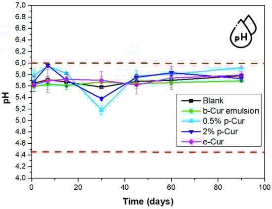 From Figure 4 it is observed that the emulsions with e-Cur and b-Cur do not affect the pH values over time. This was expected since the e-Cur and b-Cur emulsions presented small droplets which remain stable up to 90 days compared to emulsions with 0.5 and 2% w/v p-Cur which exhibited agglomerates and unstable morphology, also affecting the pH stability of emulsions. Therefore, from these measurements it can be concluded that e-Cur and b-Cur emulsions present steady pH values during storage, with no significant variations, making them suitable for cosmetic dermal applications.