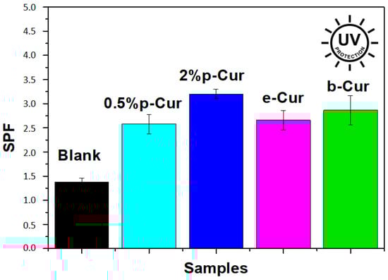 Exposure to UV light has a destructing effect on skin health, accelerating the process of photoaging, causing skin redness, premature aging, decreased skin elasticity and collagen synthesis. Consequently, sun protection constitutes a significant feature of cosmetic products. Curcumin is considered a great natural sunscreen agent, due to its active constituents, known as flavonoids. Several studies have shown that the flavonoids are quite beneficial for preventing UV-induced oxygen free radical generation and lipid peroxidation, i.e., events involved in pathological status, such as photoaging and skin cancer. The quantitative measurement of the effectiveness of a sunscreen is expressed by the sun protection factor (SPF). In order to be effective in preventing sunburn and other skin damage, a sunscreen product should have a wide range of absorbance between 290 nm to 400 nm []. Figure 5 presents the SPF values of the prepared emulsions compared to the blank. SPF values were calculated according to the Equation (1), and the absorption values were obtained in the range of 290–320 nm. All emulsions showed SPF factor values varying from 2.5 to 3.2 while the blank presents 1.3 SPF value, which is an indication that the addition of Cur and Cur derivatives improves SPF values. Furthermore, it was proved that by increasing the content of p-Cur, the SPF value increased (0.5% p-Cur and 2% p-Cur had 2.58 and 3.2 SPF values respectively). b-Cur emulsion presented a slightly higher SPF value than e-Cur emulsion while the 2% p-Cur emulsion presented the highest SPF value. According to FDA (U.S. Food and Drug Administration), any sunscreen agent utilized in sunscreen emulsions should display a minimum of SPF 2, and it is clear that all prepared emulsions meet this requirement [].The obtained results demonstrated the ability of Cur, e-Cur and b-Cur to absorb UV radiation and hence proved their UV protection ability.
