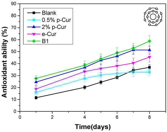 To counter the aging effects, the majority of consumers make use of skin products with antioxidant agents. Antioxidant agents are an important part of skin care formulations that prevent oxidative cell damage by acting as free radical scavengers. Free radicals (superoxide radicals [O2 radical dot−], hydroxyl radicals [OH radical dot] and singlet oxygen) are produced continuously in the human body by complex redox reactions and play a crucial role in the development of aging. Moreover, antioxidants are necessary ingredients in any emulsion to avoid the demulsification and quality deterioration occurred from lipid oxidation. Therefore, the addition of antioxidants to the emulsions and the study of their antioxidant ability is mandatory [,]. Curcumin has the capability of scavenging superoxide radicals, hydrogen peroxide and nitric oxide from activated macrophages. The major bioactive substances in Cur are polyphenols, including curcumin, which is well known, besides other polyphenols, for its excellent antioxidant activity []. During antioxidant studies, all samples presented enhanced antioxidant ability compared to the blank sample (Figure 6). This improved antioxidant activity of emulsions is attributed to the presence of the phenolic compounds due to the incorporation of p-Cur, e-Cur and b-Cur. There was a clear trend that the antioxidant capacity of the emulsions increased sharply with increasing content of p-Cur. When the p-Cur content was 2% w/v, the antioxidant capacity of the emulsion reached 51.3% while the antioxidant capacity of the 0.5% p-Cur emulsion was 32.7% []. This was expected as the phenolic compounds and curcumin content also increases (468 μg/mL at 2% p-Cur and 286 μg/mL at 0.5% p-Cur emulsion). However, although the b-Cur emulsion exhibits the highest antioxidant activity, the content of b-Cur antioxidant agent in the emulsion is 1% w/v is worth mentioning. This is explained by the fact that b-Cur presents the highest contain of phenolic compounds and curcumin (535 mg/mL) as it was proved by LC-HRMS Orbitrap Analysis (the results of method are presented in supplementary). This indicates that the b-Cur is more effective than both p-Cur and e-Cur (curcumin content in e-Cur was 321 μg/mL). These results are in total accordance with Murali MohanYallapu’s study of the in vitro antioxidant activity of b-Cur against HepG-2 cells that confirmed its enhanced antioxidant effect compared to neat e-Cur []. Furthermore, it is observed from Figure 6 that all emulsions with Cur compounds presented a progressive increase in the % antioxidant capacity up to 8 days after their preparation. This was also observed by Pilar Almajano’s working group that studied the synergistic effect of bovine serum albumin (BSA) on model oil-in-water emulsions containing a variety of green tea catechins. They found out a progressive increase in antioxidant activity for up 31 days of study []. This may be attributed to the synergistic effect taking place during storage between curcumin compounds and olive oil used in the oil phase of the prepared emulsions [].