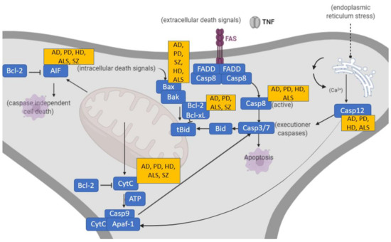 Apoptotic molecular changes and the involvement of apoptotic proteins have been observed in neurodegenerative disorders, including AD [33], Parkinson’s disease (PD) [34], Huntington’s disease (HD) [35] and amyotrophic lateral sclerosis (ALS) [36]. Some or the specific molecular apoptotic changes occurring in these neurodegenerative disorders, also observed in SZ, will be extensively discussed in Section 3 and briefly summarized in Figure 2. Importantly, at a genetic level, different known risk alleles related to apoptosis have been found to be associated with SZ in the recent literature, including apoptotic mediator BCL11B, BCL2L12, BNIP3L and ENOX1 genes [37].