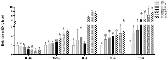 The intestinal IL-6 and IL-8 expressions in the H240 and H480 groups and the intestinal TNF-α and IL-1 expressions in the H120, H240, and H480 groups were significantly higher than those in the H0 group, whereas the IL-10 expression in the H60, H120, H240, and H480 groups was significantly lower than that in the H0 group (p < 0.05; Figure 1).