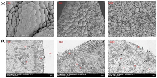The gastric SEM and intestinal TEM observations are presented in Figure 2A,B, respectively. As shown in Figure 2A, the degree of gastric mucosal damage increased with increasing dietary histamine levels. Furthermore, as shown in Figure 2B, dietary histamine damaged intestinal epithelial cells, and organelle lysis was observed in the H480 group.