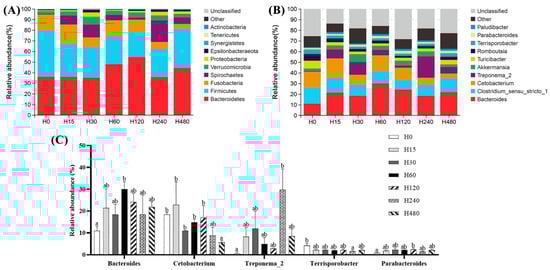 As shown in Table 7, the Goods coverage of all the groups was above 99%, indicating that the sequencing depth in this study was adequate. The Shannon, Simpson, Chao1, and ACE indices were not significantly affected by the experimental diets (p > 0.05). The structural composition analysis of microbiota exhibited that Bacteroidetes, Firmicutes, Fusobacteria, and Spirochaetes were the dominant phyla of all groups (Figure 3A). The top 10 genera of all groups are shown in Figure 3B, and the Bacteroides, Clostridium sensu stricto, and Cetobacterium were the three dominant genera in all groups. As shown in Figure 3C, the abundance of Bacteroides in the H60 group, the abundance of Treponema2 in the H240 group, and the abundance of Parabacteroides in the H120 group were significantly higher than those in the H0 group, whereas the abundance of Catobacterium in the H480 group and the abundance of Terrisporobacter in the H240 group were significantly lower than those in the H0 group (p < 0.05).