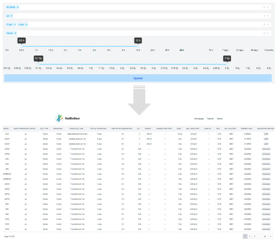Example output page of RadBioBase. The database was searched using the “X-rays & γ-rays”, “Cancer” and “up” options, by selecting the time and dose ranges 0.5–-12 h and 0.1–5 Gy, respectively.