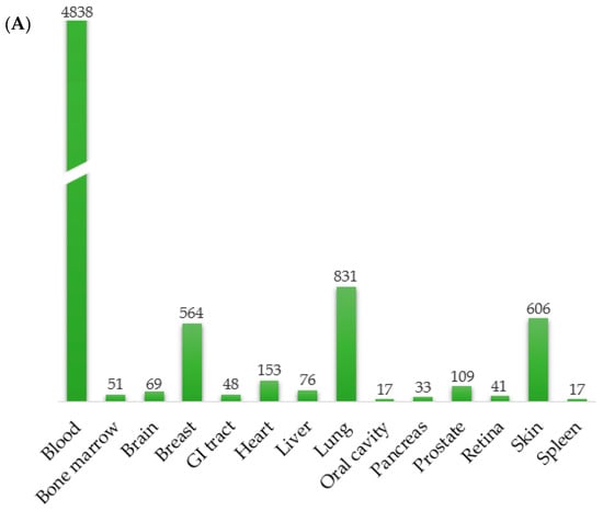 Using RadBioBase, we performed a comparison among all different types of irradiation (X-rays, γ-rays, protons, carbon ions and α-particles), to unveil basic commonalities across all therapeutic modalities and mammalian tissue types. One important consideration regarding this database is that, since its generation is based on publicly available data, it is inevitably more representative for the types of tissues and irradiation most frequently used across the corresponding studies. To collectively describe the content of this database, we estimated the number of entries for tissue type, radiation type, organism type and normal versus cancer cell type (Figure 2A–D). Overall, the database includes 14 types of cells/tissues (Figure 2A). The highest number of entries are assigned to blood, breast and lung tissue, possibly reflecting the types of cancers where irradiation represents a frequent standard of care treatment. Similarly, 50% of the entries correspond to X-rays, which have been in research and clinical use for longer periods than the more recent radiation types (Figure 2B). Moreover, 74% of the entries represent normal and 26% cancer cells (Figure 2C). The percentages of entries in human versus rodent cells are similar, leading to a ratio of 1.06 (Figure 2D). This information facilitates the design of downstream analyses, interpretations of the results and inferences about disease pathways, especially in cases where the data are combined to generate universal signatures.