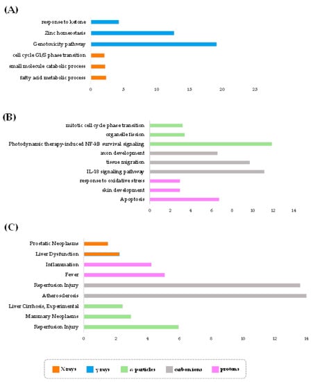 As shown in Figure 2E, the number of non-overlapping genes for each radiation type tends to be higher than the genes that are in common in two or more radiation types. The fact that transcriptional responses tend to be radiation type-specific strongly indicates that along with the p53 cascades, each radiation modality can activate distinct biological pathways to exert its effects on cells. In an analogous manner, radiation-specific transcripts might be associated with different disease pathways, which can be predictors of specific side effects. To shed light on these aspects, we performed a detailed analysis of the overrepresented biological and disease pathways related to each type of radiation separately, along with the corresponding genes.