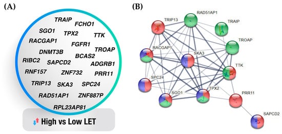 Gene signature of high- versus low-LET radiation types. (A) Twenty-two-gene signature characteristic of response to high-LET vs. low-LET irradiation. (B) Network depicting the associations (edges) of twelve signature genes/gene products (nodes) in cell cycle (red), cell division (blue) and inflammation (green).