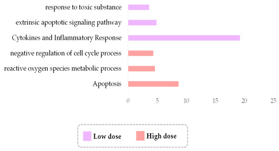 Overrepresented biological pathways (affinity propagation) for all 445 DEGs in low-dose (0.3–0.5 Gy) radiation group and all 668 DEGs in high-dose (0.6–2.0 Gy) radiation group considering all types of irradiation. The x-axis corresponds to the enrichment ratio.