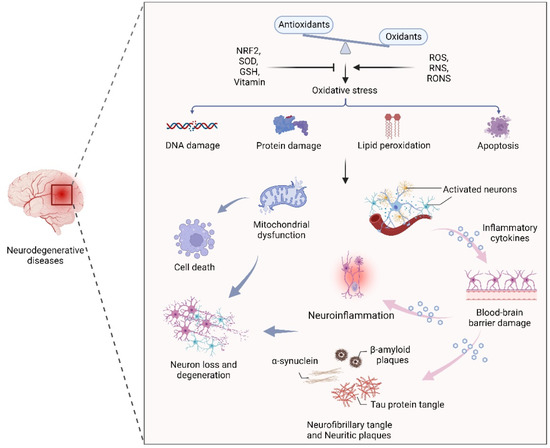 The effect of oxidative stress in neurodegenerative diseases. An oxidant/antioxidant imbalance leads to oxidative stress, which causes DNA and protein damage, lipid peroxidation, and apoptosis. Dysfunctional mitochondria and activated neurons secrete inflammatory cytokines that cross the blood–brain barrier, leading to inflammation, α-synuclein, β-aggregation, and neuronal plaque accumulation in neurons, leading to neuron loss and degeneration.