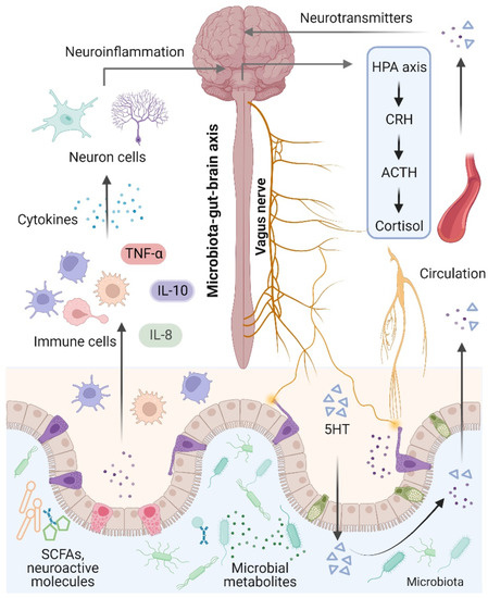 The brain and the gut microbiota are strictly intertwined and communicate in a variety of ways, including the production of bacterial metabolites, neurotransmitters, and cytokines [74] (Figure 2). Notably, the term “microbiota–gut–brain axis” refers to an interaction between the brain and the gut microbiota that involves four major routes of communication [75,76]. The first route of communication involves the vagus nerve, which connects the enteric nerve system and the brain stem. Recent research indicates that the gut microbiota influences host behaviors such as anxiety, feeding, and depression by activating vagal neurons and altering neurotransmitters such as γ-aminobutyric acid (GABA) and oxytocin in the brain [77,78]. The second important mode that directly or indirectly affects brain activity involves serotonin, which is mainly produced by gut enterochromaffin cells and modulates a variety of physiological processes. Interestingly, increased levels of serotonin and serotonin precursors alleviated depression in a mouse model of depression after treatment with the probiotic Bifidobacterium [79]. Thirdly, the gut microbiota plays an essential role in microglial activation and neuroinflammation. For instance, Luck and colleagues demonstrated that germ-free mice carry more immature microglia than conventional mice, and Bifidobacterium spp. can activate microglia through transcriptional activation [80]. In addition, alterations in microglial function were also observed in NDs and other behaviors, suggesting that the gut microbiota mediates effects on NDs through microglia [81]. Notably, the gut microbiota plays a vital role in energy harvest and neuroinflammation, and alterations in the gut–brain vagal pathway may promote obesity. It has been demonstrated that a diet-induced shift in the gut microbiome may disrupt vagal gut–brain communication resulting in microglia activation, increased gut inflammation, and body fat accumulation [82,83]. Finally, the gut microbiota communicates by transferring chemical signals directly to the brain. A previous study indicated that short-chain fatty acids (SCFAs) derived from the fermentation of the gut microbiota had been shown to modulate neuroplasticity in the CNS and improve depressive behavior in mice [62].