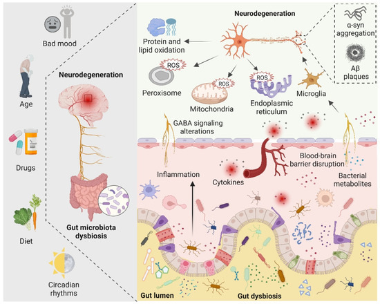 The role of the gut microbiota in neurodegeneration is depicted schematically. Bad mood, increasing age, drugs, dietary changes, and circadian rhythms can disrupt gut microbiota homeostasis. When gut dysbiosis occurs, beneficial bacteria in the gut are transformed into pathogenic bacteria, producing a large number of harmful metabolites and proinflammatory molecules, resulting in increased blood–brain barrier permeability and peripheral inflammatory responses, thereby aggravating oxidative stress in the brain. At the same time, dysbiosis can induce bad mood. Increased levels of ROS in neuronal mitochondria, endoplasmic reticulum, and peroxisomes, increased protein and lipid oxidation, and accumulation of neurotoxic proteins lead to neurodegeneration.