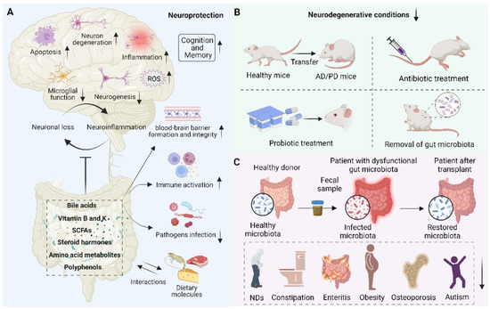 Schematic representation of the role of the gut microbiota in neuroprotection. (A) Beneficial metabolites such as bile acids, vitamins, short-chain fatty acids (SCFAs), steroid hormones, amino acid metabolites, polyphenols, etc., released by the gut microbiota and interacting with dietary molecules, can promote blood–brain barrier formation and integrity, reduce inflammation, reduce oxidative stress, reduce neuronal apoptosis, activate immune response, prevent pathogen infection, and thus play an important role in neuroprotection. (B) Fecal microbial transfer (FMT), antibiotic and probiotic treatment, and removal of gut microbiota were found to decrease neurodegenerative conditions and reduce the pathophysiology of NDs. (C) The scheme of transferring the gut microbiota from a healthy donor to a patient with dysfunctional gut microbiota and restoring the microbiota, thereby improving human health, such as treating NDs, constipation, enteritis, obesity, osteoporosis, and autism.