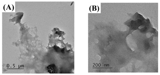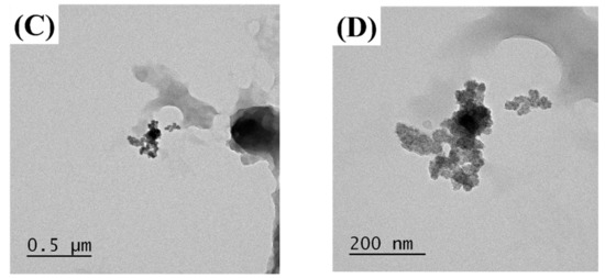 Like Huseynov’s method [25], SEM and TEM were taken to visually confirm the particles in the sample. To visually confirm the shape of the sample, it was photographed with a field emission scanning electron microscope (S-4800, Hitachi Ltd., Chiyoda City, Japan). The samples were coated with platinum and photographed at a voltage of 5 kV. In order to visually confirm the transmittance of the sample, a TEM (field emission transmission electron microscope, JEM-2100F, JEOL, Akishima, Japan) image was taken. The sample was dispersed in methanol, dried on filter papers (1002-090, 90 mm, Whatman, Maidstone, UK), and then photographed.