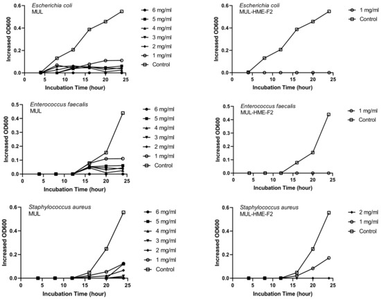 MUL and HME-MUL-F2 were treated with S. aureus and E. faecalis. In the case of E. coli, the antibacterial effect was confirmed after 16 h, which is the aquatic growth phase. In the case of MUL, as the treatment concentration increased, antibacterial effects on all three pathogenic bacteria also increased dependent on concentration. When the highest concentration (6 mg/mL) was used, a complete growth inhibitory effect was detected (Figure 5).