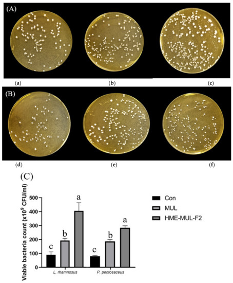 In order to confirm the effect of the HME-DDS formulation on the growth of probiotics, L. rhamnosus and P. pentosaceus were treated with HME-MUL-F2 and the degree of proliferation was evaluated by a flat colony counting method [28].