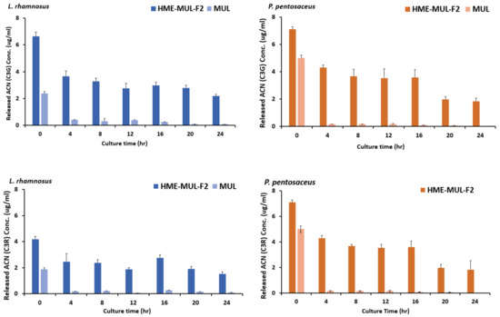 Additionally, the ACN present in the HME-MUL-F2 preparation existed in the form of sodium alginate and protein. It could be degraded by the action of various enzymes in the intestinal environment where the pH would change rapidly, especially in a high pH environment such as pH 5.5. It is thought that HME-DDS can act while maintaining a long half-life in each part of the gastrointestinal tract by preventing loss of ACN. As a result of confirming release characteristics, the release rate of C3G from MUL in L. rhamnosus increased was from 13.4% at the beginning of culture to 54.0% at 24 h and that of C3R changed from 8.4% at the beginning of culture to 33.4% at 24 h. In the case of HME-DDS formulation, the release rate of C3G was increased from 21.0% at the beginning of culture to 84.75% at 24 h. In addition, in P. pentosaceus, the release rate of C3G from MUL was 17.75% at the beginning of culture and 55% at 24 h of culture. In the case of the HME-DDS formulation, the release rate of C3G was increased from 23.66% at the beginning of the culture to 85.7% after 24 h and the release rate of C3R was increased from 14.33% at the beginning of the culture to 53.8% after 24 h. In the case of the MUL-F2 formulation, it was confirmed that the release rate was further increased over time in an environment in which probiotics cells were cultured.