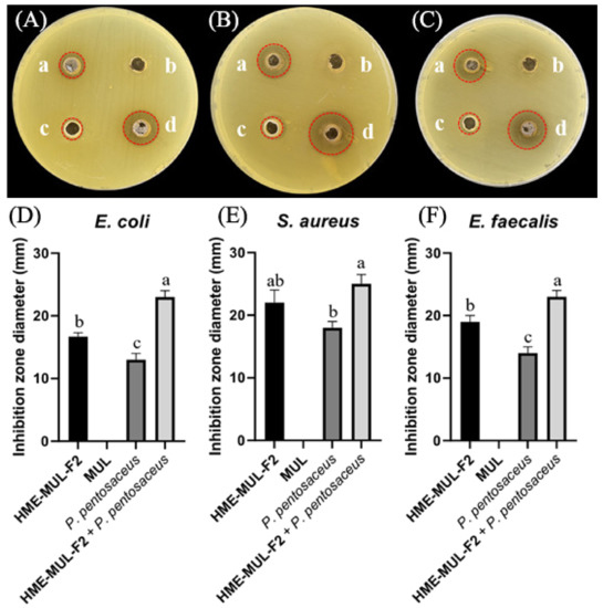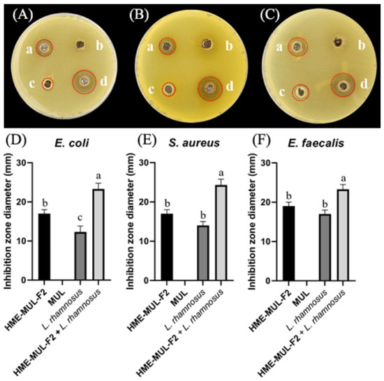 Inhibition zones in the presence of lactic acid bacterial probiotic L. rhamnosus against test pathogens after treatment with HME-DDS formulation (HME-MUL-F2). (A,D): Inhibition against E. coli. (B,E): Inhibition against S. aureus. (C) and (F): Inhibition against E. faecalis. a: treatment with HME-MUL-F2, b: treatment with MUL, c: treatment with L. rhamnosus only, d: treatment with L. rhamnosus + HME-MUL-F2. (A–C) Photos of clear zone in the presence of probiotics, HME-MUL-F2, and MUL. (D–F) Quantification of inhibition zone diameter in the presence of MUL, HME-MUL-F2, probiotics only, and probiotics + HME-MUL-F2, respectively. a,b value differences in the same condition (p < 0.05). Data are presented as mean ± SD (n = 3).When L. rhamnosus cell suspension alone was used as treatment against pathogenic bacteria E. coli, S. aureus, and E. faecalis, diameters of growth inhibition zones were 13.0 ± 1.0 mm, 18.0 ± 1.0 mm, and 14.0 ± 1.2 mm, respectively. However, when cell suspension of P. pentosaceus in combination with HME-MUL-F2 was used as treatment, diameters of growth inhibition zones were 23.0 ± 1.0 mm, 23.3 ± 1.5 mm, and 22.0 ± 1.5 mm, respectively (Figure 11).