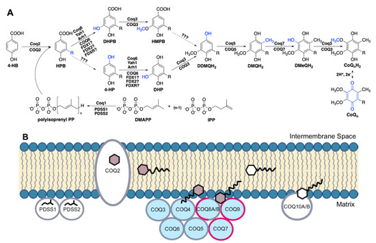 - Xie, L.X.; Ozeir, M.; Tang, J.Y.; Chen, J.Y.; Jaquinod, S.K.; Fontecave, M.; Clarke, C.F.; Pierrel, F. Overexpression of the Coq8 kinase in Saccharomyces cerevisiae coq null mutants allows for accumulation of diagnostic intermediates of the coenzyme Q6 biosynthetic pathway. J. Biol. Chem. 2012, 287, 23571–23581. [Google Scholar] [CrossRef] [PubMed]
