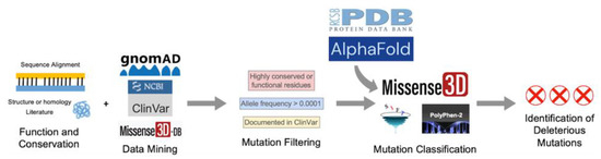The selected variants were classified with three mutation classifiers, each using a different algorithm. Missense3D (http://missense3d.bc.ic.ac.uk/missense3d/, accessed on 30 March 2022) reports deleteriousness based on local structural feature changes that may be destabilizing [38]. SIFT (https://sift.bii.a-star.edu.sg/, accessed on 30 March 2022) scores variants as “Tolerated” or “Deleterious” based on evolutionary conservation [40]. Polyphen-2 (http://genetics.bwh.harvard.edu/pph2/, accessed on 30 March 2022) uses a Naïve Bayes classifier to report the likelihood of a mutation being damaging based on a combination of sequence- and structure-based criteria, whenever structures are available. Variants are scored as “Benign”, “Possibly Damaging”, and “Probably Damaging” [41]. Default settings were used whenever applicable. Results and interpretations from the three mutation classifiers can be found in Supplemental Table S1. The pipeline for SNV selection and classification is illustrated in Figure 2.