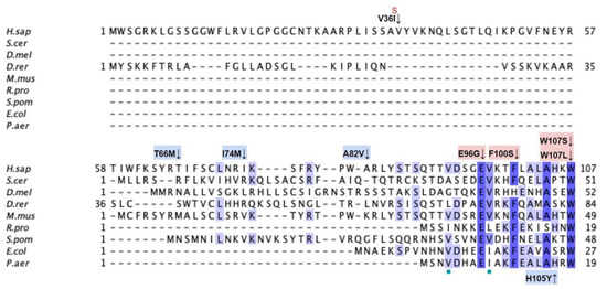 - Paulela, J.A.; Gomes, F.; Camandona, V.L.; Alegria, T.G.P.; Netto, L.E.S.; Bleicher, L.; Barros, M.H.; Ferreira-Junior, J.R. Coq3p relevant residues for protein activity and stability. FEMS Yeast Res. 2021, 21, foab055. [Google Scholar] [CrossRef] [PubMed]