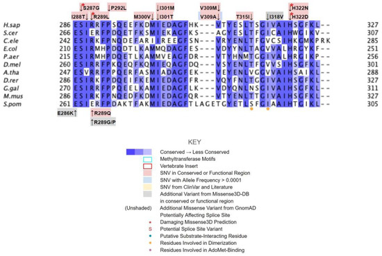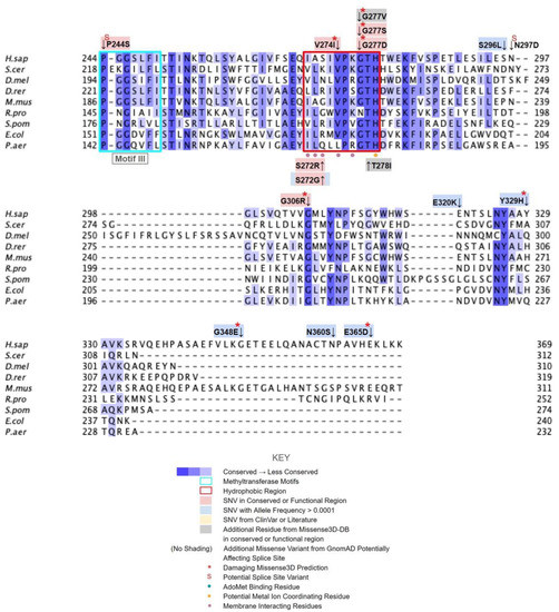 Motif III (V241 to I250) lies on the fifth β-strand as well as the loop and parts of the helix preceding it (Figure 7C). This loop is essential for the alignment of the methyltransferase motifs and consists of Pro and Gly residues to facilitate the turn [65]. GnomAD reported two SNVs, K243I and P244S, in highly conserved residues of this motif (Figure 7D). Neither SNV was classified as structurally damaging by Missense3D. However, it is worth noting that these SNVs occur near a splice junction and may therefore result in more profound changes to protein expression in addition to changes in protein sequence.