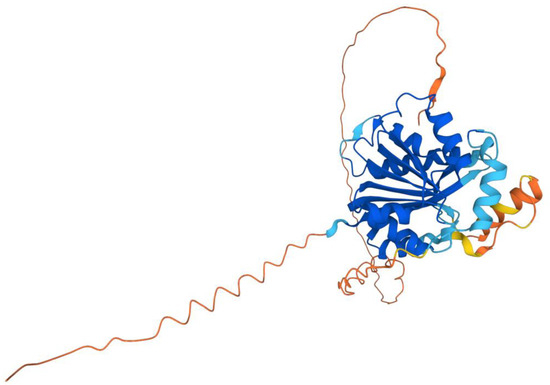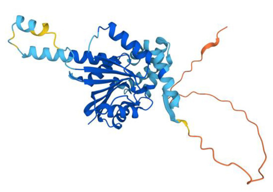 AlphaFold model of the COQ5 monomer. Model color corresponds to model confidence as described in Figure 4. Figure was generated by the AlphaFold Protein Structure Database; adapted with permission from [39,54].